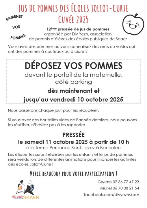 vous trouverez joint le flyer de l'opération Jus de Pomme de l'école organisée par l'association Div Yezh.